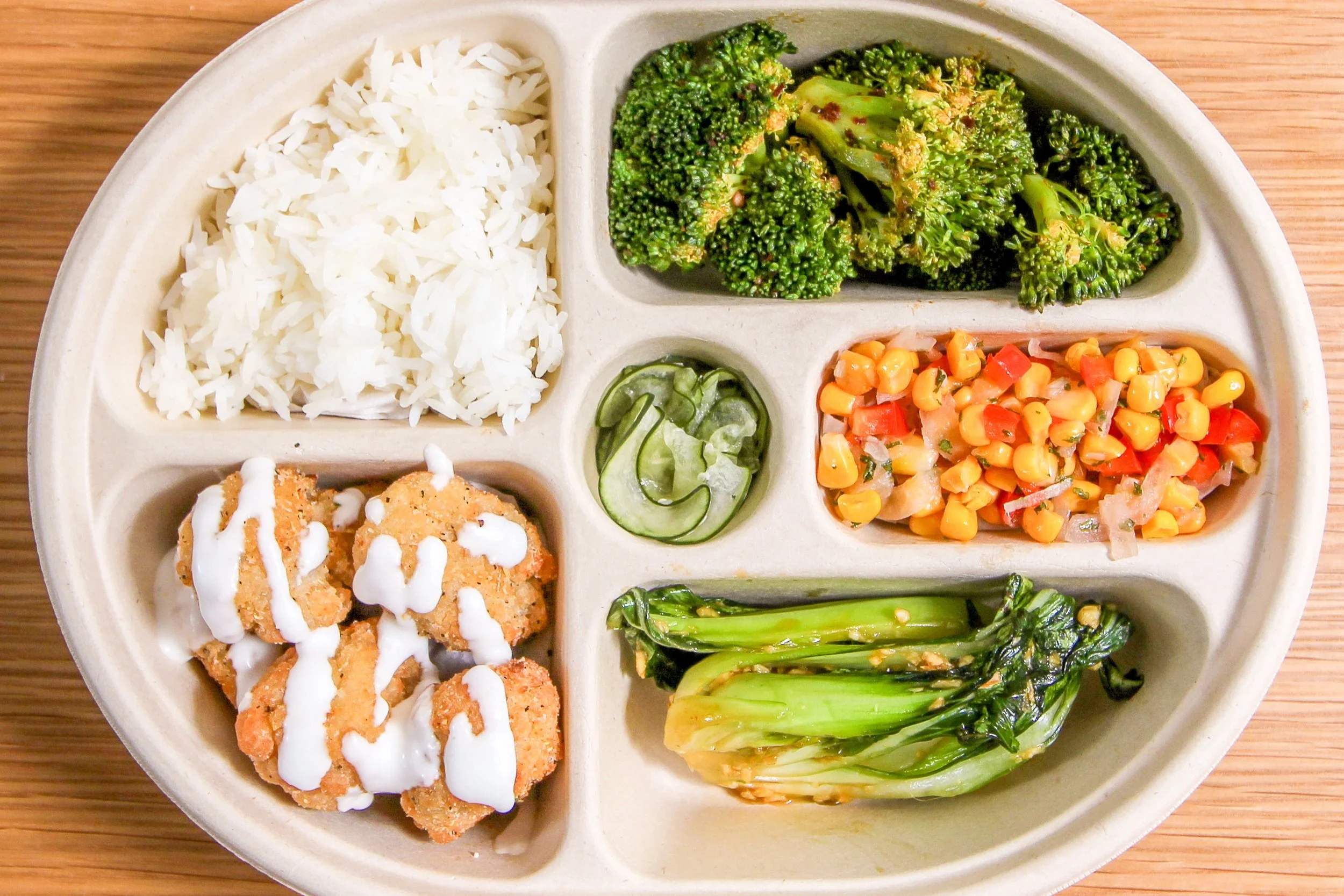 white rice, crispy chicken, chili roasted broccoli, roasted corn salad, baby bok choy, pickled cucumber, lemon garlic toum