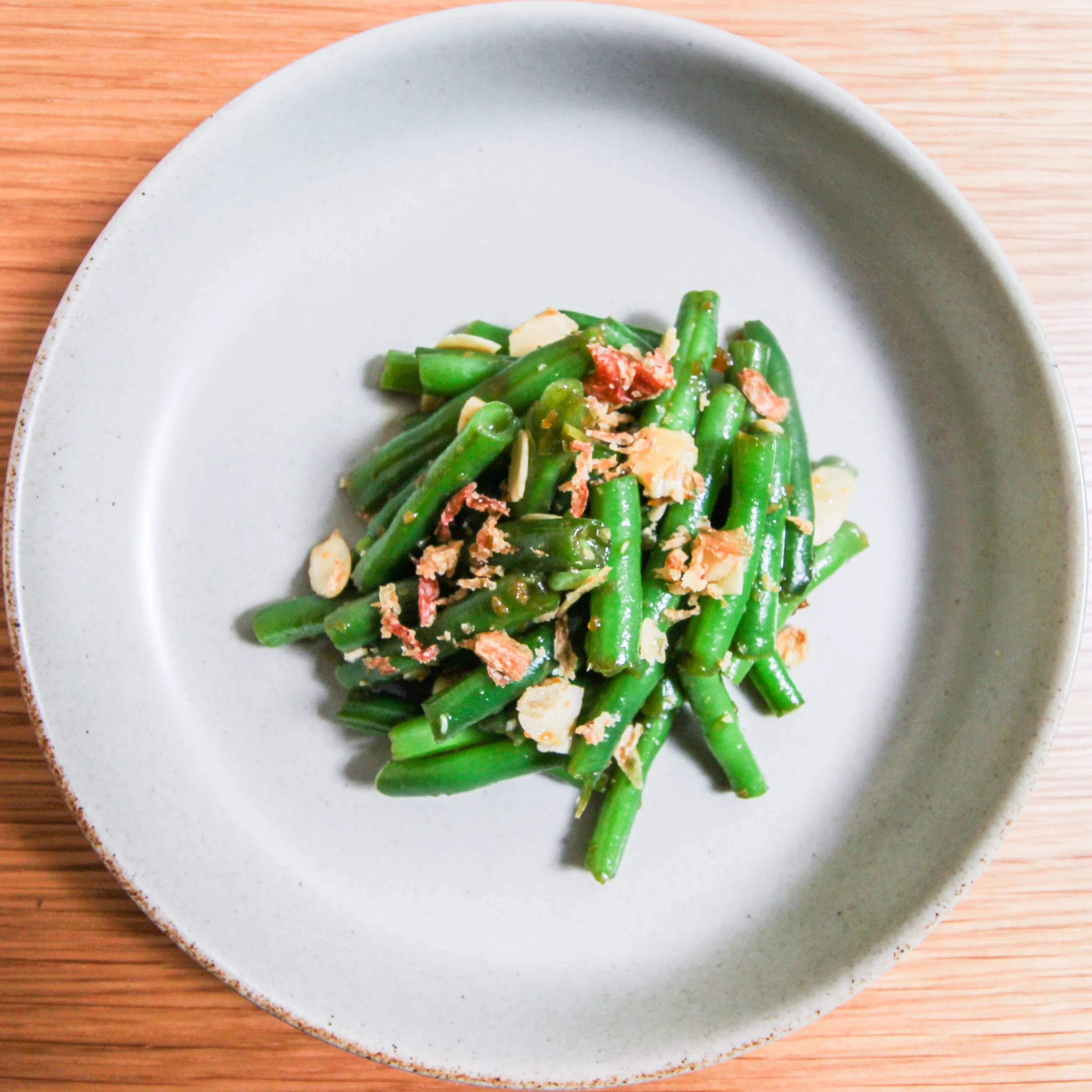 blanched green beans, garlic tare sauce, toasted almonds, fried garlic; served chilled